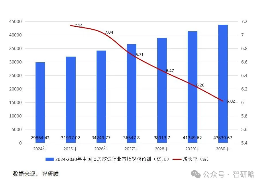 据智研瞻预测,2024-2030年中国旧房改造行业市场规模增长率在6%-8%,2030年中国旧房改造行业市场规模43839.67亿元,同比增长6.02%。2024-2030年中国旧房改造行业市场规模预测如下: