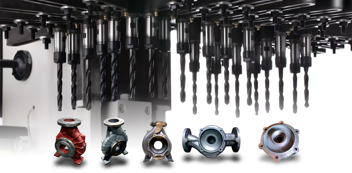 达人多轴钻床为泵打孔提供更高的加工效率,钻头一次打孔,减少人工并提高加工效率。