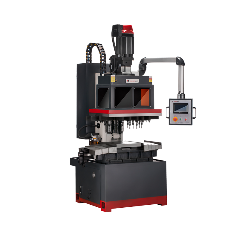 通过可移动工作台,两工位联动,一次装夹,钻孔、攻丝一次完成。
